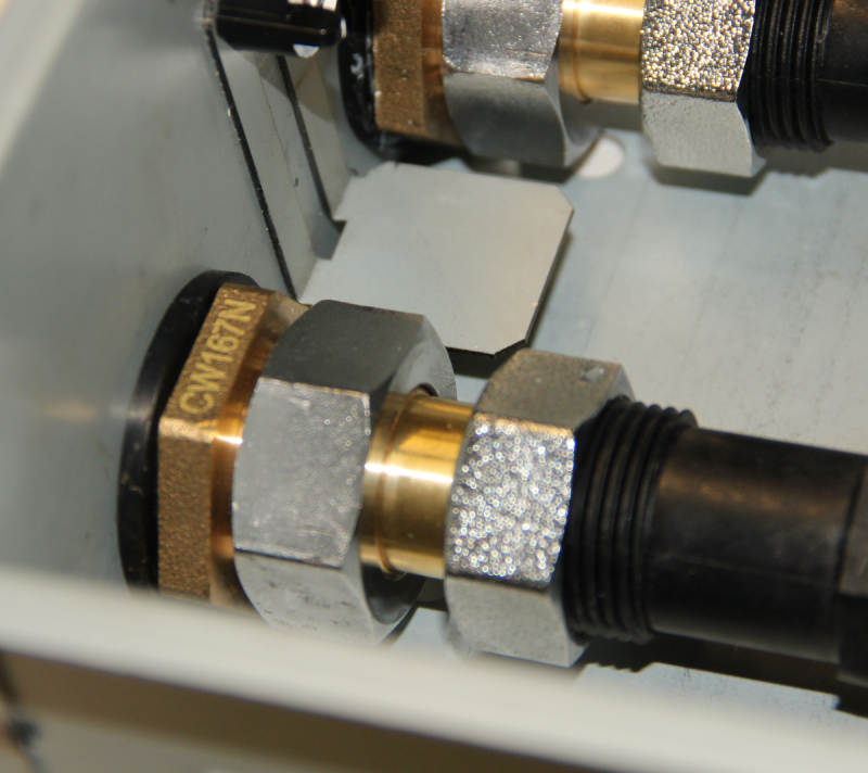 Die Minol Messstation Mini in Durchgangsausführung ist mit DVGW zertifizierten Kugelhähnen und lösbaren Verschraubungen für Aufputzzähler G ¾ B x 80 mm ausgestattet.